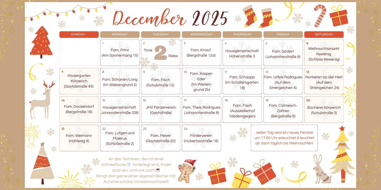Adventsfenster 2025, Aktion des Dorffördervereins. Jeden Tag wird ein neues Fenster um 17:00 Uhr erleuchten und leuchtet ab dann täglich bis Weihnachten. Kommen Sie vorbei!