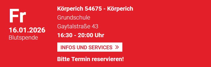 Unsere Blutspendetermine finden 4 – 5 mal jährlich, jeweils freitags von 16:30 Uhr bis 20:00 Uhr, in der Grundschule St. Hubertus Körperich, Gaytalstr. 43, statt.