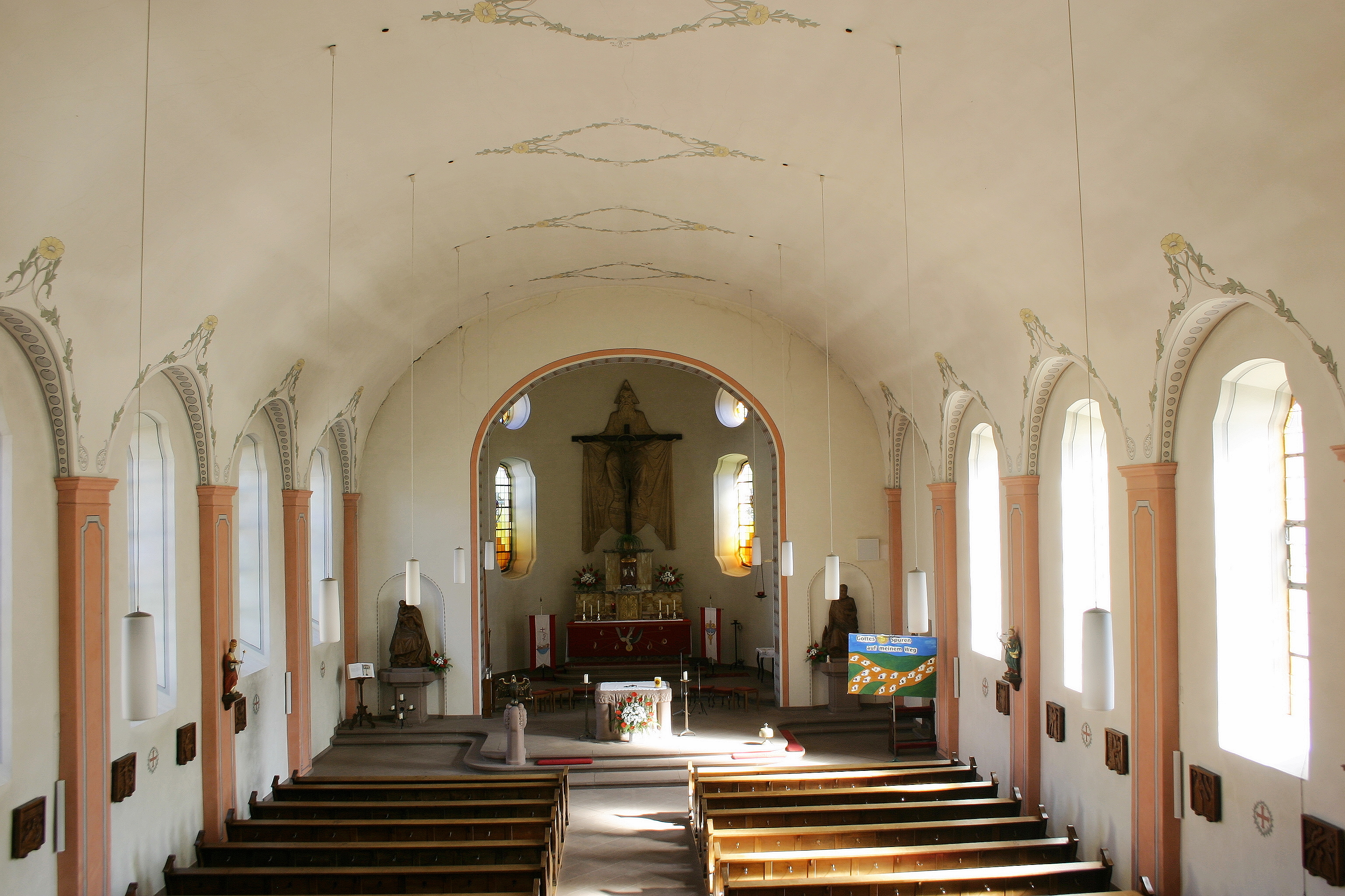 Ein Triumphbogen leitet zum Altarraum über. Der Bogen und die leichte Erhöhung und Verschmälerung des Chores gegenüber dem Laienraum sollen ihn als heiligen Bereich besonders hervorheben. Dieses Schema ist in unserem Bistum auch bei einigen anderen Pfarrkirchen wiederzufinden. Es geht letztlich auf die um 1734 von Christian Kretschmar begonnene und von Balthasar Neumann vollendete Stiftskirche Sankt Paulin in Trier zurück, die stilbildend auf die Landkirchen des späteren 18. Jahrhunderts wirkte.