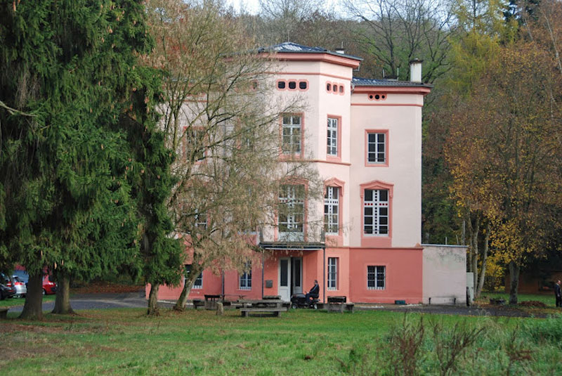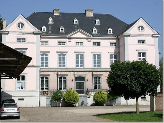 Von der mittelalterlichen Burganlage ist im südwestlichen Flügel ein fünfgeschossiger Wohnturm auf annähernd quadratischem Grundriss erhalten, an den 1734 die Kapelle (kath. Filialkirche St. Dionysius) und auf der Gegenseite im 19. Jahrhundert ein Wirtschaftsgebäude angebaut wurde. Einige breit abgefaste Fenstereinfassungen, im dritten Obergeschoss z.T. mit spitzbogigem Blendmaßwerk im Sturz, weisen auf eine Bauzeit im 14. oder 15. Jahrhundert; die übrigen Öffnungen stammen aus dem 19. und 20. Jahrhundert. Für den Aufbau des späteren beim Anbau der Kapelle 1734 entstandenen und nach Kriegszerstörung 1945 in alter Form wiederhergestellten steilen Walmdachs wurden die Umfassungsmauern geringfügig erhöht. Das Erdgeschoss dient seit 1968 als Vorraum der Kirche mit neuem Zugang von der Straße aus. Das Wohnhaus hat über einem hohen Kellersockel zwei Vollgeschosse und ein zusätzliches, als Schüttboden genutztes Mezzaningeschoss, über dem das mäßig steile Walmdach beginnt. Die Hauptfassade folgt dem Typus kleinerer Landschlösser des 18. Jahrhunderts, bei dem zwei kräftig vorspringende, übergiebelte Seitenrisalite gegenüber der schwächer betonten Mittelachse dominieren. Letztere wird hier nur durch den Hauseingang und einen auf Konsolen sitzenden kleinen Dreiecksgiebel über der Traufe markiert. Einer straffen Fassadengliederung dienen die axial angeordneten, gerade verdachten Segmentbogenfenster, glatte Kantenlisenen und unterschiedlich profilierte Bankgesimse. Dem mittleren Fassadenabschnitt zwischen den Risaliten ist eine Terrasse mit zweiarmiger, gegenläufiger Freitreppe vorgelegt, die vermutlich wie das aufwändige schmiedeeiserne Geländer und das auf Eisenstützen ruhende Glasdach erst aus der Zeit um 1900 stammt. Im Inneren ist nicht nur die originale Raumaufteilung mit acht (im Erdgeschoss) bzw. zwölf Räumen beiderseits eines durchgehenden Mittelflurs, sondern auch die baufeste Ausstattung nahezu vollständig erhalten, darunter alle Türen, beide Treppen, ein Raum breiter Wandschrank und mehrere Stuckdecken. Besondere Beachtung verdient im vorderen Erdgeschossraum rechts des Flurs eine wohl zur Bauzeit eingebrachte raumumschließende Bildtapete aus der Pariser Manufaktur Dufour. Sie zeigt in großflächigen Bildern auf 23 Bahnen (für die beiden letzten war kein Platz mehr) in tropischer Landschaft Szenen aus „Paul et Virgine“, einem Ideen Rousseaus verarbeitenden, erstmals 1787 erschienenen Moderoman von Bernardin de St. Pierre. Als Vorlagen dienten Gemälde von Jean Broc, einem Schüler Jacques Davids. Gemalte Supraporten mit mythologischen Darstellungen, ein gusseiserner Ofen mit neugotischem Dekor und eine Garnitur Biedermeiermöbel vervollständigen die einheitliche bauzeitliche Ausstattung des Raumes.